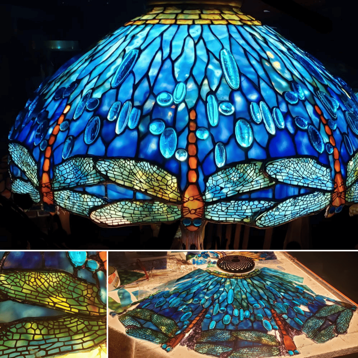 When the lamp is turned on, the light shines through the glass shade and illuminates the stained glass. The illuminated glass is beautiful and very attractive and brings the lamp to life.
