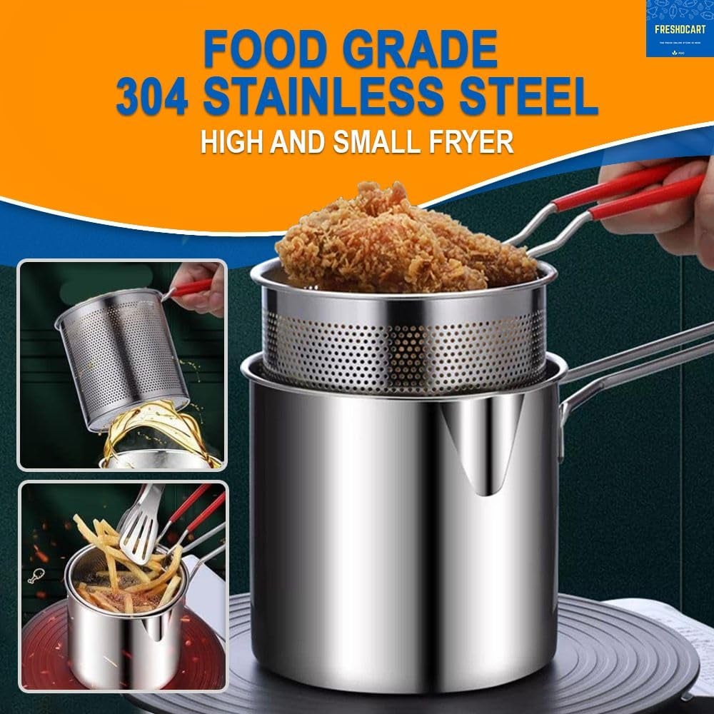 Made from durable stainless steel, this fryer pan ensures even heat distribution and long-lasting performance.
