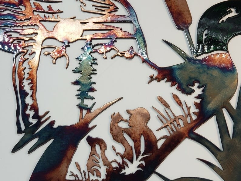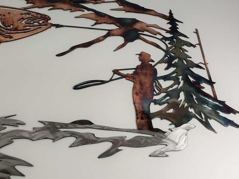 Mallard in a full 9.84" Wide by 11.41" tall ,Up at Dawn Trout Fishing in a full 13.38" Wide by 8" tall ,Modern Elk in a full 38" Wide by 40" tall,Material is iron,it is a great feature décor or a compliment to other art work.