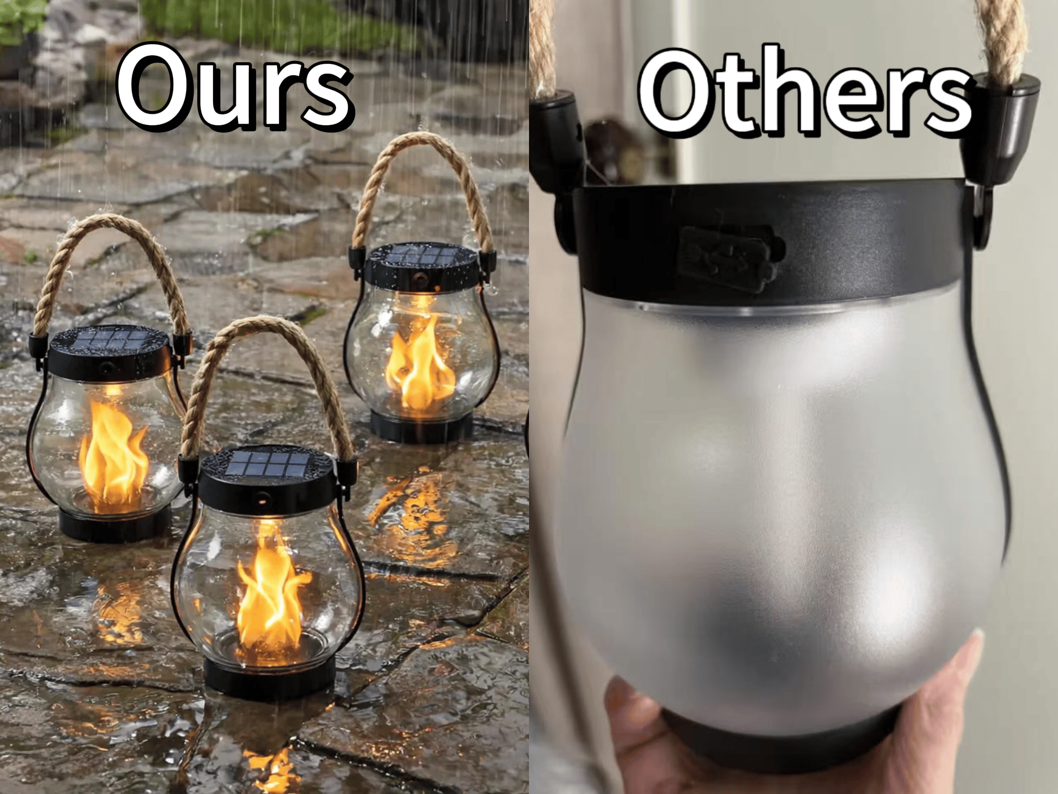 Q: Is the flame real? No — this solar lantern uses a high-tech LED that flickers just like a real flame. You get the cozy vibe without the fire, heat, or risk.